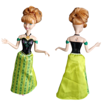 Beloved, heroic younger sister Anna, from Disney’s animated hit Frozen, absolutely dazzles in sparkling fashions with signature colors. Wearing a glittery, detailed bodice, satiny calf-length skirt, and her coronation tiara, this charming royal is truly ready to sparkle happily ever after.